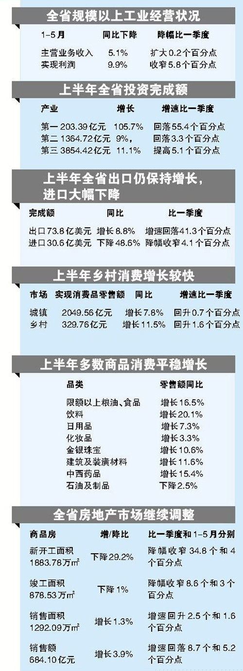 發(fā)布會(huì)上,統(tǒng)計(jì)局相關(guān)負(fù)責(zé)人表示,今年上半年,全省經(jīng)濟(jì)運(yùn)行經(jīng)歷了一季度的低迷后,在各項(xiàng)穩(wěn)增長(zhǎng)政策的有力作用下,各項(xiàng)經(jīng)濟(jì)指標(biāo)從二季度開(kāi)始回歸到平穩(wěn)增長(zhǎng)的軌道,并呈現(xiàn)企穩(wěn)回升向好的積極態(tài)勢(shì)。但穩(wěn)增長(zhǎng)壓力依然較大,經(jīng)濟(jì)回升的基礎(chǔ)仍有待夯實(shí)。隨著狠抓穩(wěn)增長(zhǎng)、促改革、調(diào)結(jié)構(gòu)、惠民生、防風(fēng)險(xiǎn)政策措施的落實(shí)到位,第三季度將進(jìn)一步鞏固經(jīng)濟(jì)運(yùn)行回升向好的勢(shì)頭,第四季度向著全年預(yù)期發(fā)展目標(biāo)攻堅(jiān)沖刺,努力實(shí)現(xiàn)各項(xiàng)目標(biāo)任務(wù)。